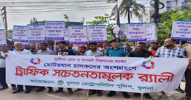 খুলনা মেট্রোপলিটন পুলিশের উদ্যোগে দুর্ঘটনা রোধ এবং যানজট নিরসনের উদ্দেশ্যে আজ সকালে খুলনা মহানগরীর রূপসা ট্রাফিক মোড়ে ইজিবাইক চালকদের অংশগ্রহণে একটি সচেতনতামূলক র্যালি অনুষ্ঠিত হয়েছে।