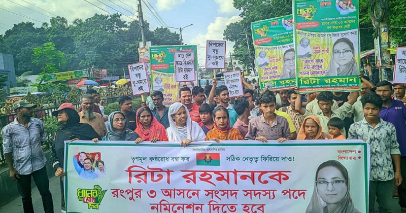 আজ বুধবার (৫ নভেম্বর) দুপুরে রংপুর মহানগরীতে মনোনয়নবঞ্চিত রিটা রহমানের পক্ষে তার কর্মী-সমর্থকরা বিক্ষোভ মিছিল করেন। মিছিলটি টাউন হল চত্বর থেকে বের হয়ে নগরীর সিটি বাজার পর্যন্ত প্রদক্ষিণ শেষে পুনরায় টাউন হল মাঠে গিয়ে শেষ হয়। এই বিক্ষোভে জেলা ও মহানগরসহ সদর উপজেলা বিএনপির পরিচিত কিংবা পদধারী কাউকে দেখা যায়নি।