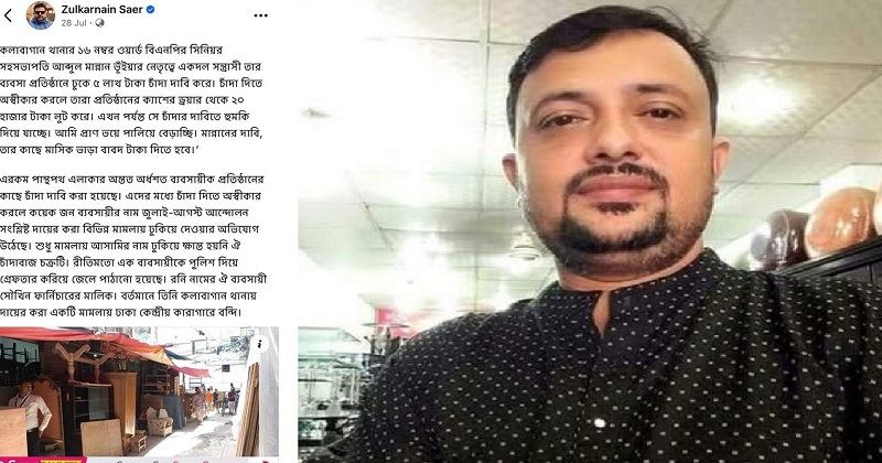 এই ঘটনার পর আরও চাঞ্চল্যকর তথ্য প্রকাশ করেন সাংবাদিক জুলকার নাঈন সায়েরও। নিজের এক ফেসবুক পোস্টে তিনি দাবি করেন, কলাবাগান থানার ১৬ নম্বর ওয়ার্ড বিএনপির সিনিয়র সহসভাপতি আব্দুল মান্নান ভূঁইয়ার নেতৃত্বে একদল সন্ত্রাসী অন্য আরেক ব্যবসায়ীর ব্যবসা প্রতিষ্ঠানে ঢুকে ৫ লাখ টাকা চাঁদা দাবি করে এবং ক্যাশ ড্রয়ার থেকে ২০ হাজার টাকা লুট করে। বর্তমানে তিনি প্রাণভয়ে আত্মগোপনে রয়েছেন বলেও পোস্টে উল্লেখ করেন।