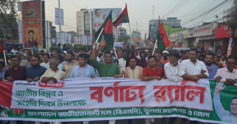 বিপ্লব ও সংহতি দিবস উপলক্ষে খুলনা মহানগর ও জেলা বিএনপির উদ্যোগে শুক্রবার বিকালে নগরী শিববাড়ি মোড়ে অনুষ্ঠিত হয়েছে আলোচনা সভা ও বর্ণাঢ্য র্যালি।
