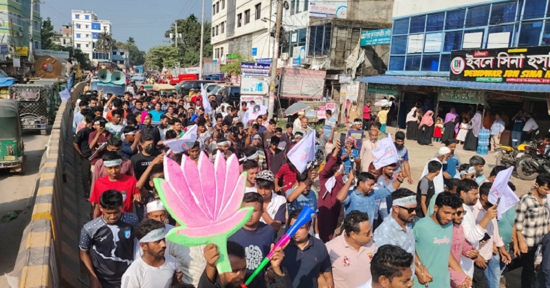 মিছিলে ‘শাপলা কলি’ প্রতীকের পাশাপাশি দলের দক্ষিণাঞ্চলের মুখ্য সংগঠক হাসনাত আব্দুল্লাহর ছবি সম্বলিত ব্যানার ও ফেস্টুন শোভা পায়।