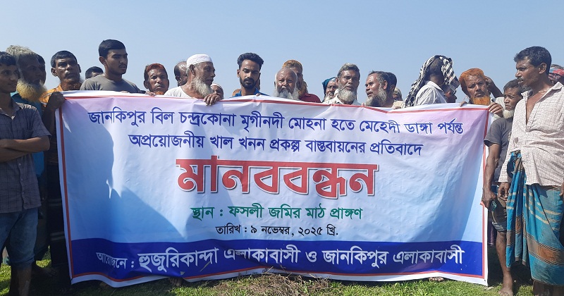 শেরপুরের নকলা উপজেলার জানকিপুর বিল চন্দ্রকোনা মৃগীনদী মোহনা থেকে মেহেদী ডাঙ্গা পর্যন্ত অপ্রয়োজনীয় খাল খনন প্রকল্প বাস্তবায়নের প্রতিবাদে মানববন্ধন অনুষ্ঠিত হয়েছে।
