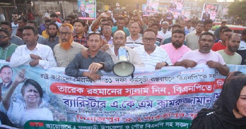 দিনাজপুরের ফুলবাড়ীতে বিএনপির ভারপ্রাপ্ত চেয়ারম্যান তারেক রহমান ঘোষিত রাষ্ট মেরামতের ৩১দফা ও ধানের শীষের পক্ষে জনমত গঠনের লক্ষে গণমিছিল করেছে দিনাজপুর -৫ আসনের মনোনয়ন প্রত্যাশী যুক্তরাজ্য বিএনপির সহ-সভাপতি ব্যারিষ্টার কামরুজ্জামানের নেতা-কর্মি ও সমর্থক ও বিএনপির নেতাকর্মীরা।