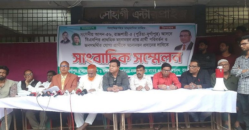 রাজশাহী-৫ (পুঠিয়া-দুর্গাপুর) আসনে সম্ভাব্য মনোনীত প্রার্থী অধ্যাপক নজরুল ইসলাম মন্ডলের মনোনয়ন পরিবর্তনের দাবিতে স্থানীয় বিএনপি ও অঙ্গ সহযোগী সংগঠনের নেতাকর্মীরা সংবাদ সম্মেলন ও মানববন্ধন করেছেন।