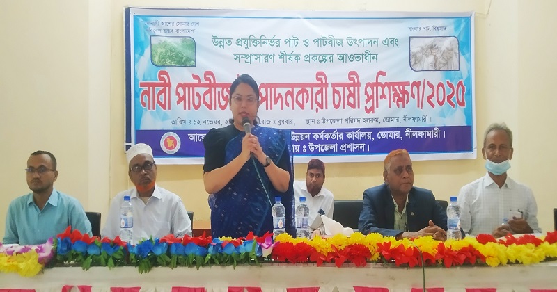 বুধবার সকালে উপজেলা পরিষদ হলরুমে উপসহকারী পাট উন্নয়ন কর্মকর্তার কার্যালয়ের আয়োজনে এবং উপজেলা প্রশাসনের সহযোগীতায় উন্নত প্রযুক্তিনির্ভর পাট ও পাটবীজ উৎপাদন এবং সম্প্রসারণ শীর্ষক প্রকল্পের আওতায় নাবী পাটবীজ উৎপাদনকারী চাষী প্রশিক্ষণ অনুষ্ঠানে প্রধান অতিথি হিসেবে উপস্থিত ছিলেন, ডোমার উপজেলা নির্বাহী কর্মকর্তা শায়লা সাঈদ তন্বী।