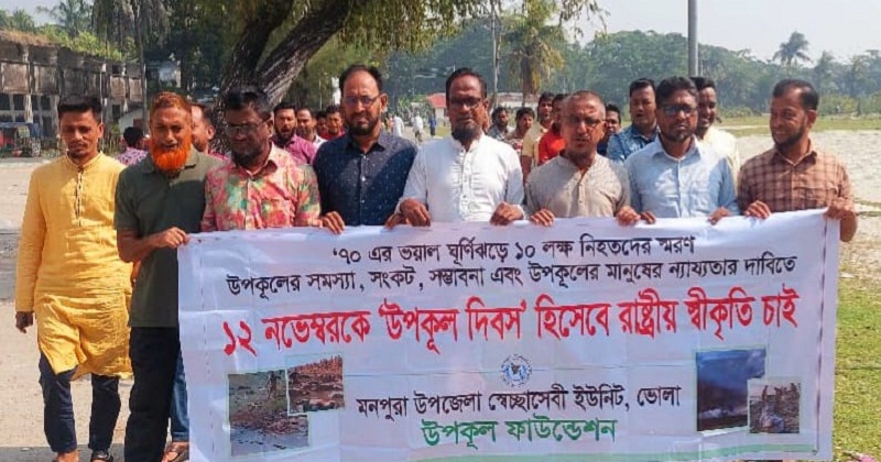 ভোলার মনপুরায় ভয়াল ১২ নভেম্বরকে জাতীয় 'উপকূল দিবস' হিসেবে রাষ্ট্রিয় স্বীকৃতির দাবিতে র্যালি করেছে উপজেলা যুবদল। উপকূল ফাউন্ডেশনের উপজেলা শাখার স্বেচ্ছাসেবী ইউনিটের উদ্যোগে এ র্যালির আয়োজন করা হয়।