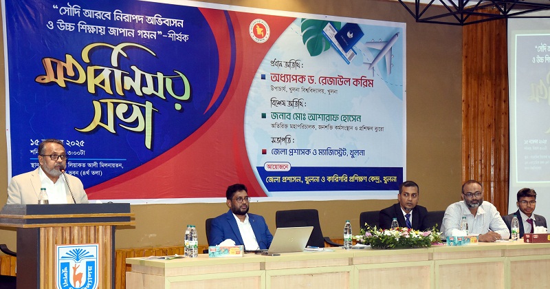 ‘সৌদি আরবে নিরাপদ অভিবাসন ও উচ্চ শিক্ষায় জাপান গমন’ শীর্ষক এক মতবিনিময় সভা আজ ১৫ নভেম্বর (শনিবার) বিকেলে খুলনা বিশ্ববিদ্যালয়ের সাংবাদিক লিয়াকত আলী মিলনায়তনে অনুষ্ঠিত হয়েছে।