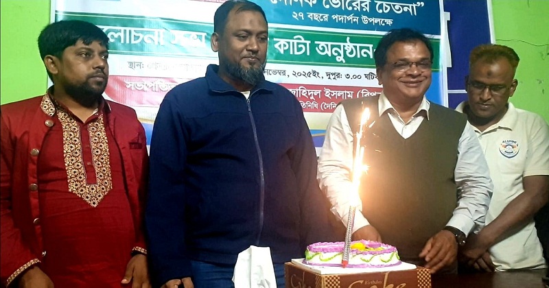 আলোচনা সভা শেষে কেক কেটে জাতীয় দৈনিক ভোরের চেতনার ২৭ তম প্রতিষ্ঠাবার্ষিকী উদযাপন করা হয়।