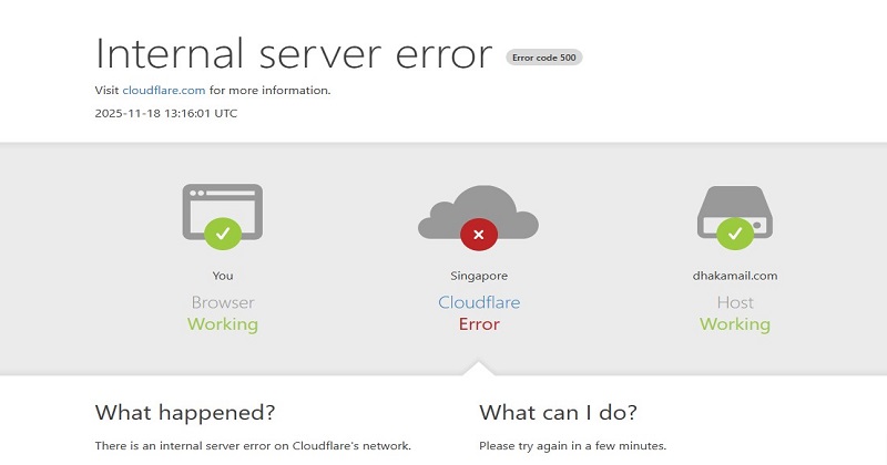 প্রভাবিত ব্যবহারকারীরা একটি বার্তা দেখেন, যেখানে উল্লেখ ছিল, ‘ক্লাউডফ্লেয়ারের নেটওয়ার্কে অভ্যন্তরীণ সার্ভার ত্রুটি দেখা দিয়েছে। কয়েক মিনিট পর আবার চেষ্টা করুন।’
