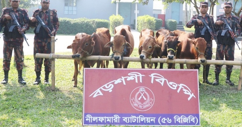 বিজিবি সূত্রে জানা যায়, বোদা উপজেলার বড়শশী ইউনিয়নের বগদুলঝুলা সীমান্ত এলাকায় গোপন সংবাদের ভিত্তিতে নীলফামারী ব্যাটালিয়নের (৫৬ বিজিবি) বড়শশী বিওপির একটি যৌথ বিশেষ টহল দল অভিযান পরিচালনা করেন। পরে অভিযান চালিয়ে ভারত থেকে অবৈধ পথে নিয়ে আসা মোট ছয়টি মালিক বিহীন গরু আটক করা হয়। আটককৃত গরুরগুলোর আনুমানিক মূল্য প্রায় ৪ লাখ ৫০ হাজার টাকা।