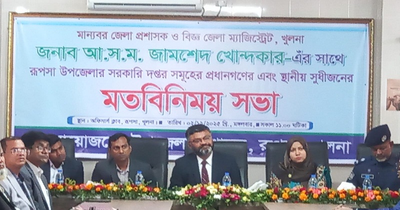 খুলনার জেলা প্রশাসক ও জেলা ম্যাজিস্ট্রেট আ স ম জামশেদ খোন্দকারের সঙ্গে রূপসা উপজেলায় কর্মরত বিভিন্ন সরকারি দপ্তরের প্রধানগণের এবং স্থানীয় সুধীজনদের সাথে এক মতবিনিময় সভা অনুষ্ঠিত হয়েছে। মঙ্গলবার (২ ডিসেম্বর) সকাল সাড়ে ১০টায় উপজেলা অফিসার্স ক্লাবে এ সভা অনুষ্ঠিত হয়।