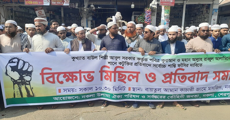 বুধবার (৩ ডিসেম্বর) সকালে নকলা উলামা ঐক্য পরিষদ ও সর্বস্তরের তৌহিদী জনতার আয়োজনে পৌর শহরের বায়তুল আমান কাচারী জামে মসজিদ প্রাঙ্গন থেকে একটি বিক্ষোভ মিছিল বের হয়ে শহরের প্রধান সড়ক প্রদক্ষিণ শেষে হলমোড় চত্বরে প্রতিবাদ সমাবেশ অনুষ্ঠিত হয়।