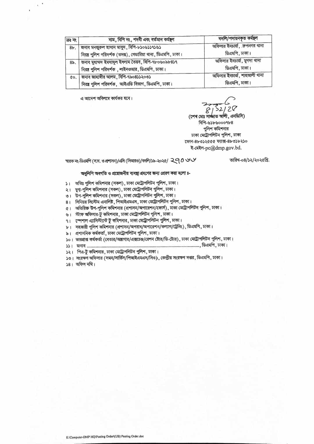 আজ বৃহস্পতিবার (৪ ডিসেম্বর) ডিএমপি কমিশনার শেখ মো. সাজ্জাত আলী স্বাক্ষরিত এক আদেশে ডিএমপির ৫০টি থানার ওসিদের রদবদল করা হয়।
