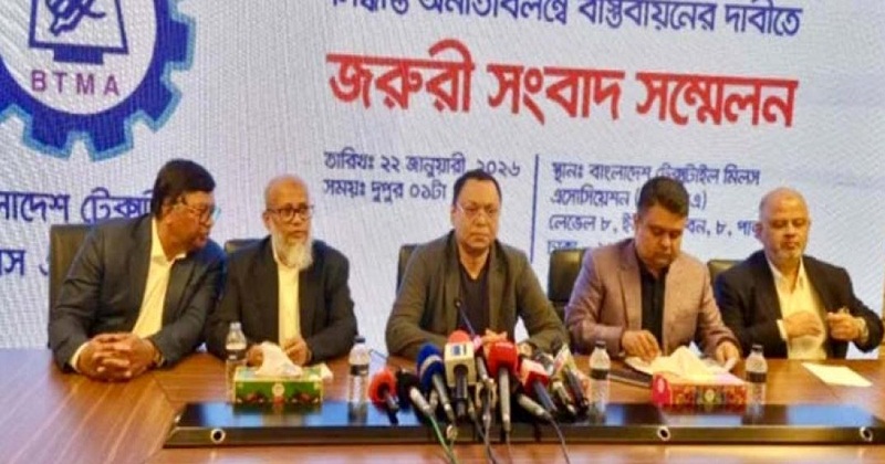 দেশের সুতা উৎপাদনকারী মিলগুলোকে রক্ষায় সরকারের কার্যকর পদক্ষেপ না থাকায় আগামী ১ ফেব্রুয়ারি থেকে অনির্দিষ্টকালের জন্য সব টেক্সটাইল মিল বন্ধ রাখার ঘোষণা দিয়েছে বাংলাদেশ টেক্সটাইল মিলস অ্যাসোসিয়েশন (বিটিএমএ)।