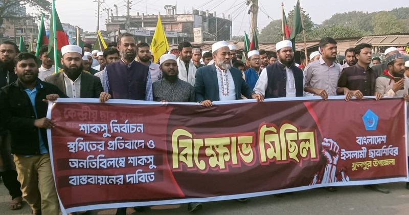 শাহজালাল বিজ্ঞান ও প্রযুক্তি বিশ্ববিদ্যালয় (শাকসু) নির্বাচন স্থগিতের প্রতিবাদে ময়মনসিংহের ফুলপুরে ইসলামী ছাত্রশিবিরের উদ্যোগে বিক্ষোভ মিছিল ও সমাবেশ অনুষ্ঠিত হয়েছে।